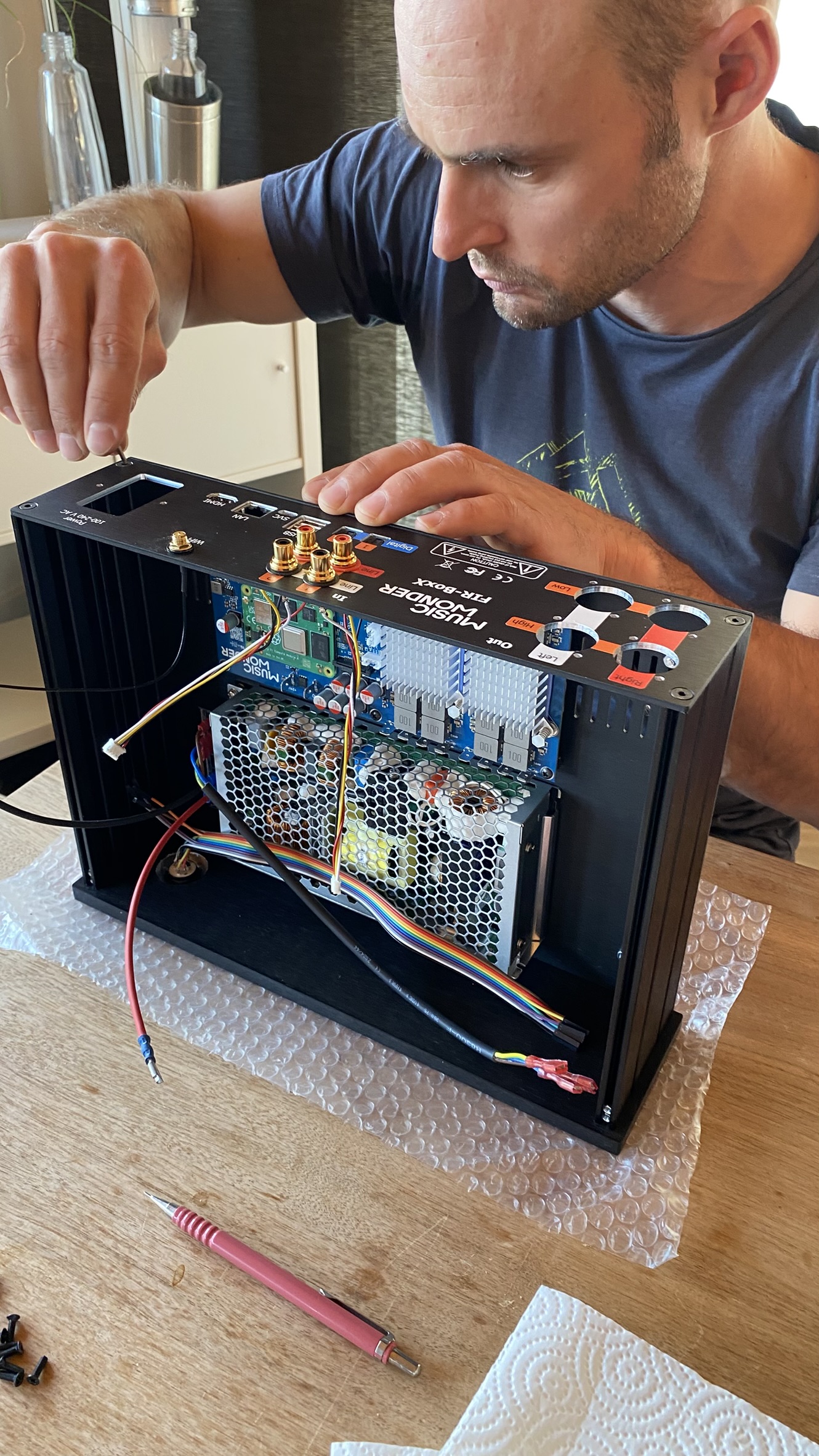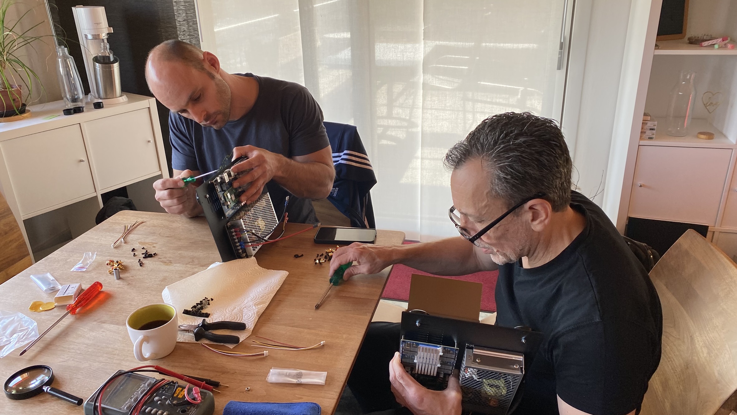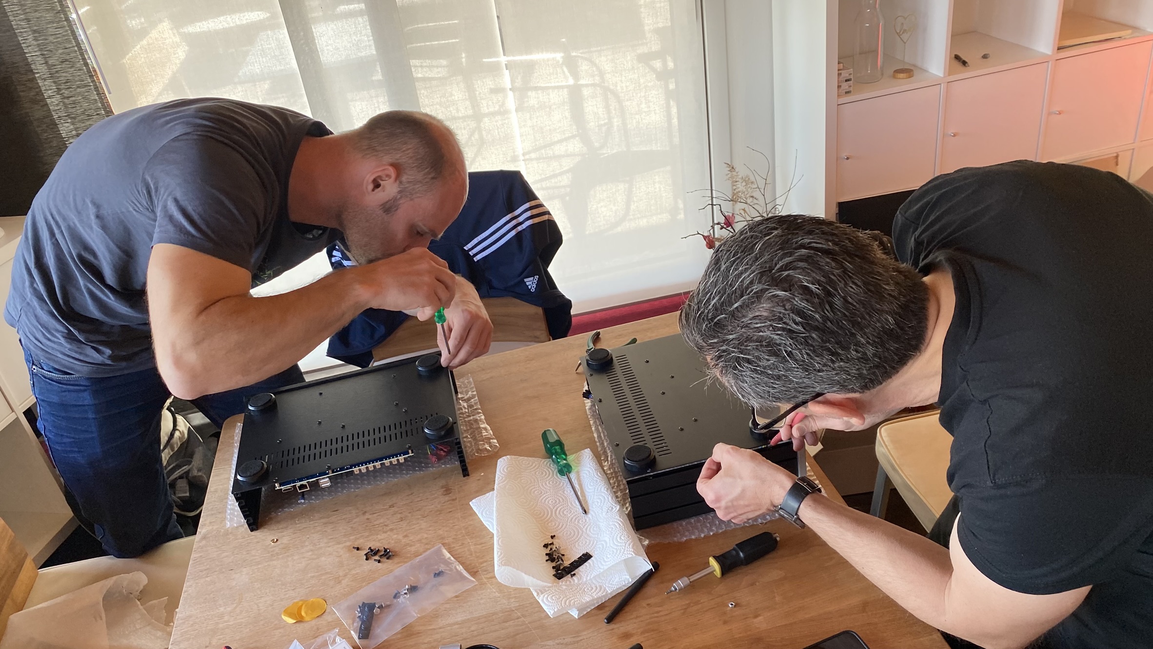 Die Bauanleitung lief auf Andreas’ grossen Screen, wir setzten uns an den Tisch und legten los, stets unter Tipps und Tricks vom Meister persönlich. Das Gehäuse ist aus hochwertigem Aluminium, sauber verarbeitet und alles passt perfekt ineinander. Der Zusammenbau machte so richtig Laune. Auch ohne 2:1-Betreuung hätte ich es hinbekommen. Die Anleitung ist verständlich aufgebaut und mit vielen Bildern versehen. Es hätte vielleicht etwas länger gedauert, man kommt aber definitiv fristgerecht ans Ziel.